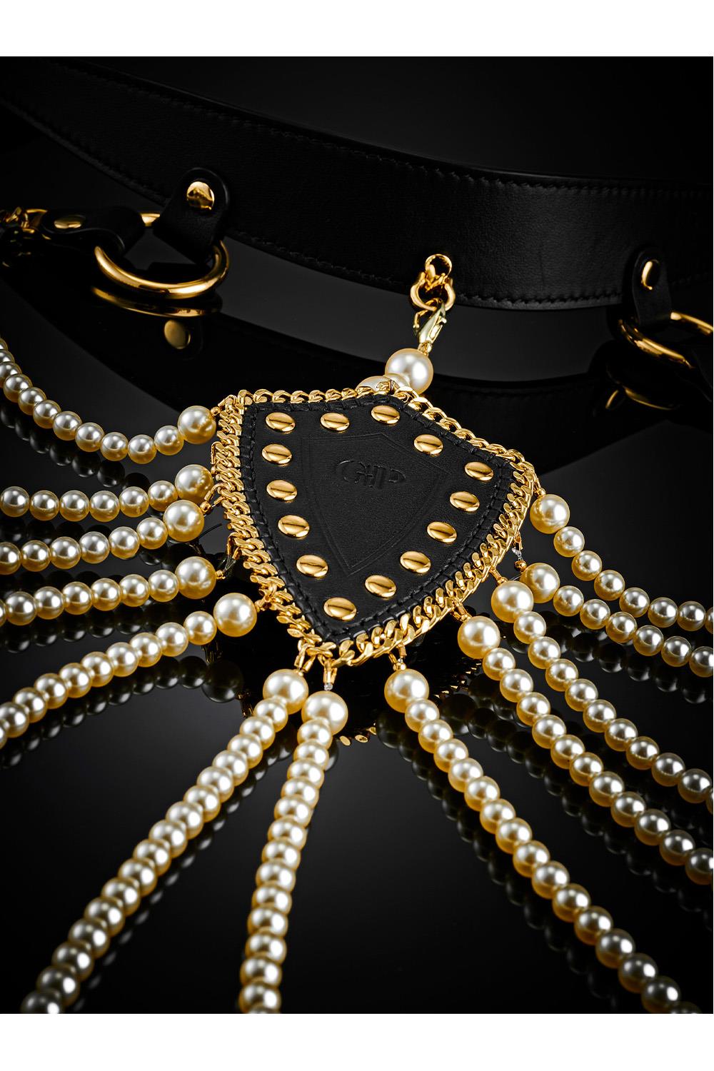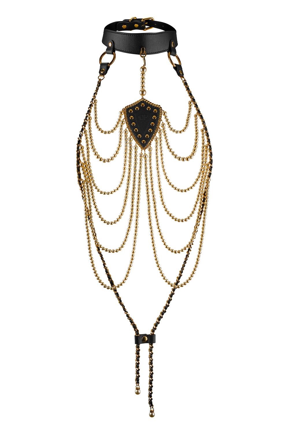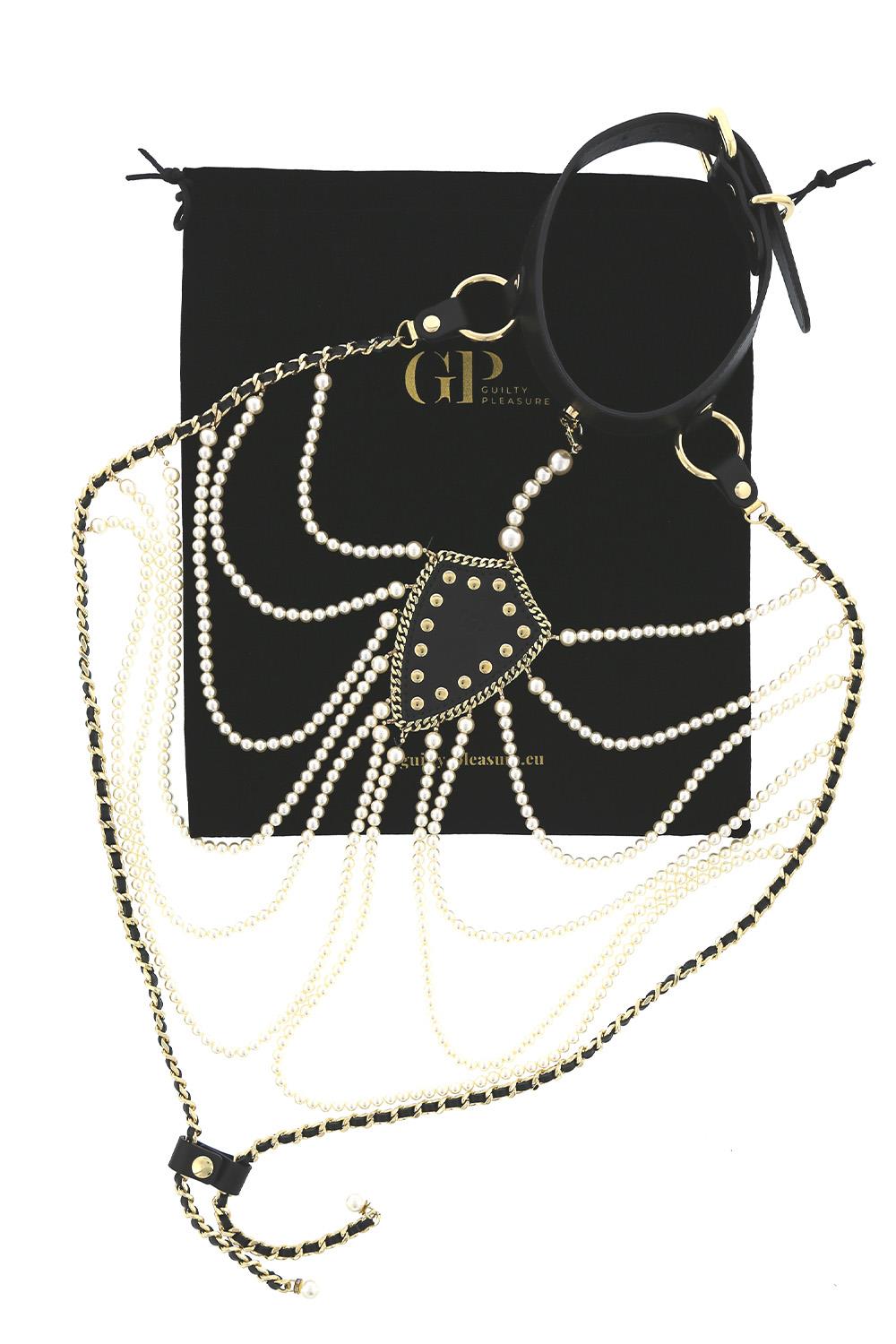 The Pearl Pleasure Collar is a visually striking accessory designed to combine elegance with erotic expression. Blending fashion aesthetics with intimate functionality, this adjustable collar features soft vegan leather paired with cascading pearl strands and gold-toned detailing - creating a luxurious look that transitions seamlessly between sensual wear and provocative styling.