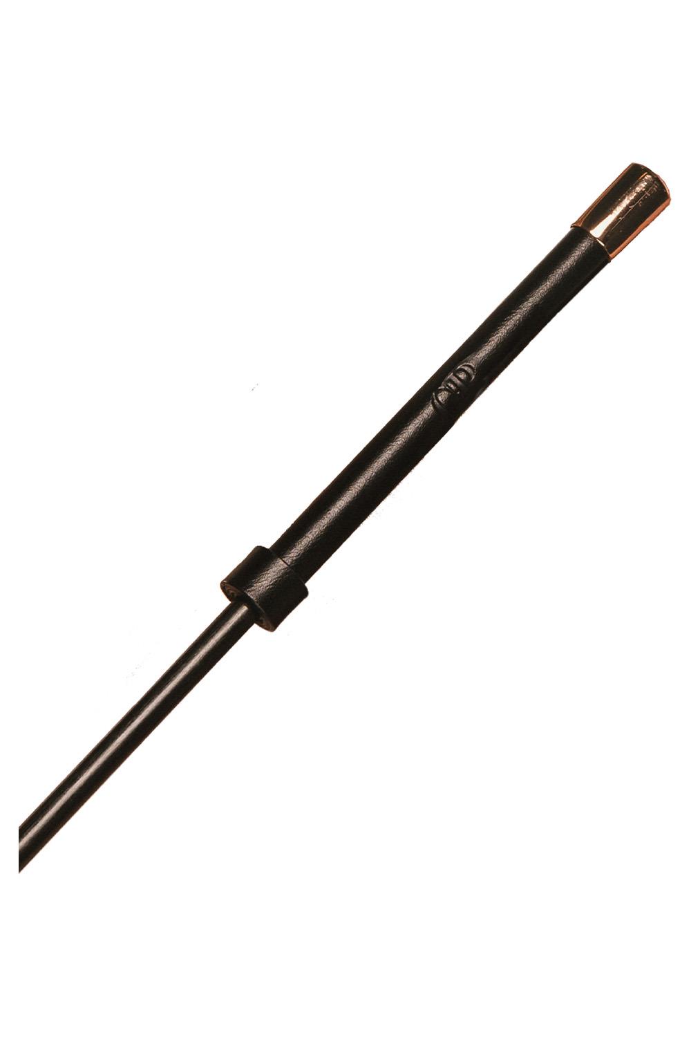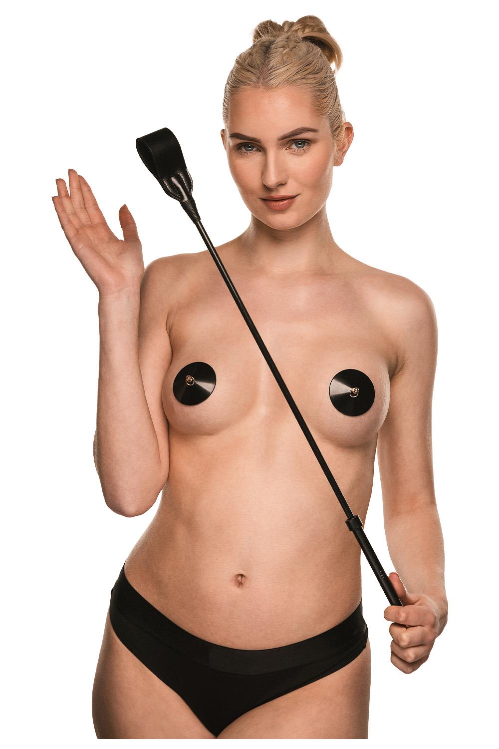 The crop features a flexible shaft for responsive handling, a soft vegan leather tip for controlled contact, and a handle with gold-toned accents that adds a refined visual finish. Lightweight and well-balanced, it allows for accurate strikes and graceful movement—perfect for guiding, teasing, or asserting dominance.