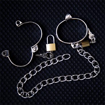 Metal ankle cuffs for the most adventurous. They have a powerful chain attached to the handcuffs with padlocks.