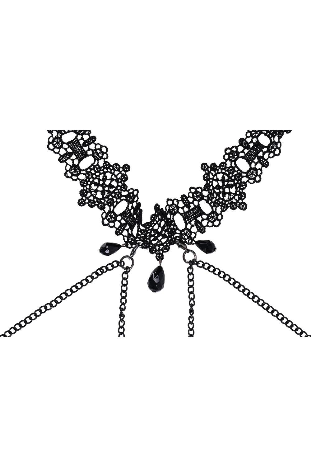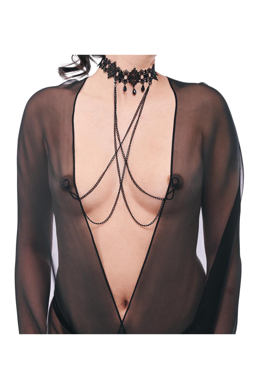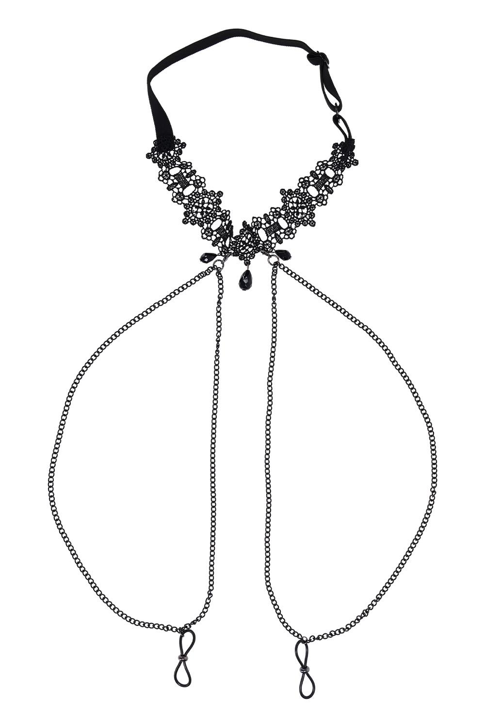 Dripping with dark elegance and sensual allure, the Lace Collar with Nipple Ties is designed for those who crave a touch of the unexpected. This ornate lace collar wraps comfortably around the neck, featuring an adjustable bra-strap-style back for the perfect fit. Glistening black gem stones dangle delicately from the collar, drawing attention to the neckline while adding a touch of mystery. The black double-chain draping connects effortlessly to adjustable nipple ties, offering a subtle yet seductive thrill. Designed to be stylish, sexy and discreet, this piece is perfect for those looking to turn up the heat - whether in public or behind closed doors.